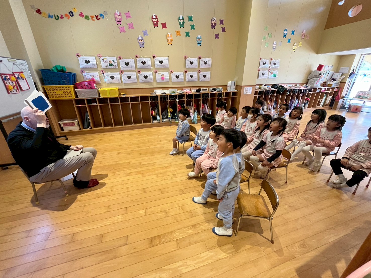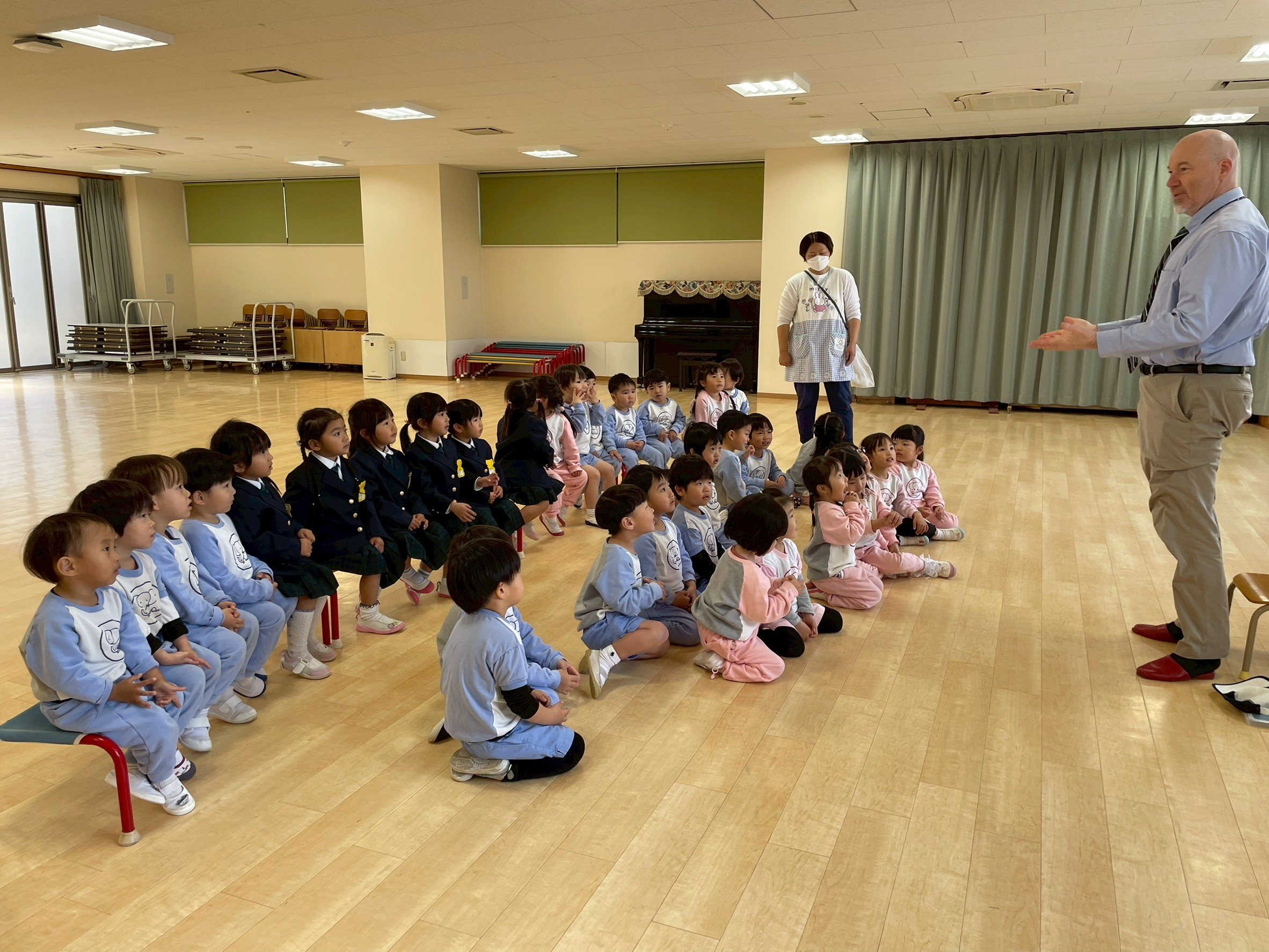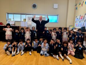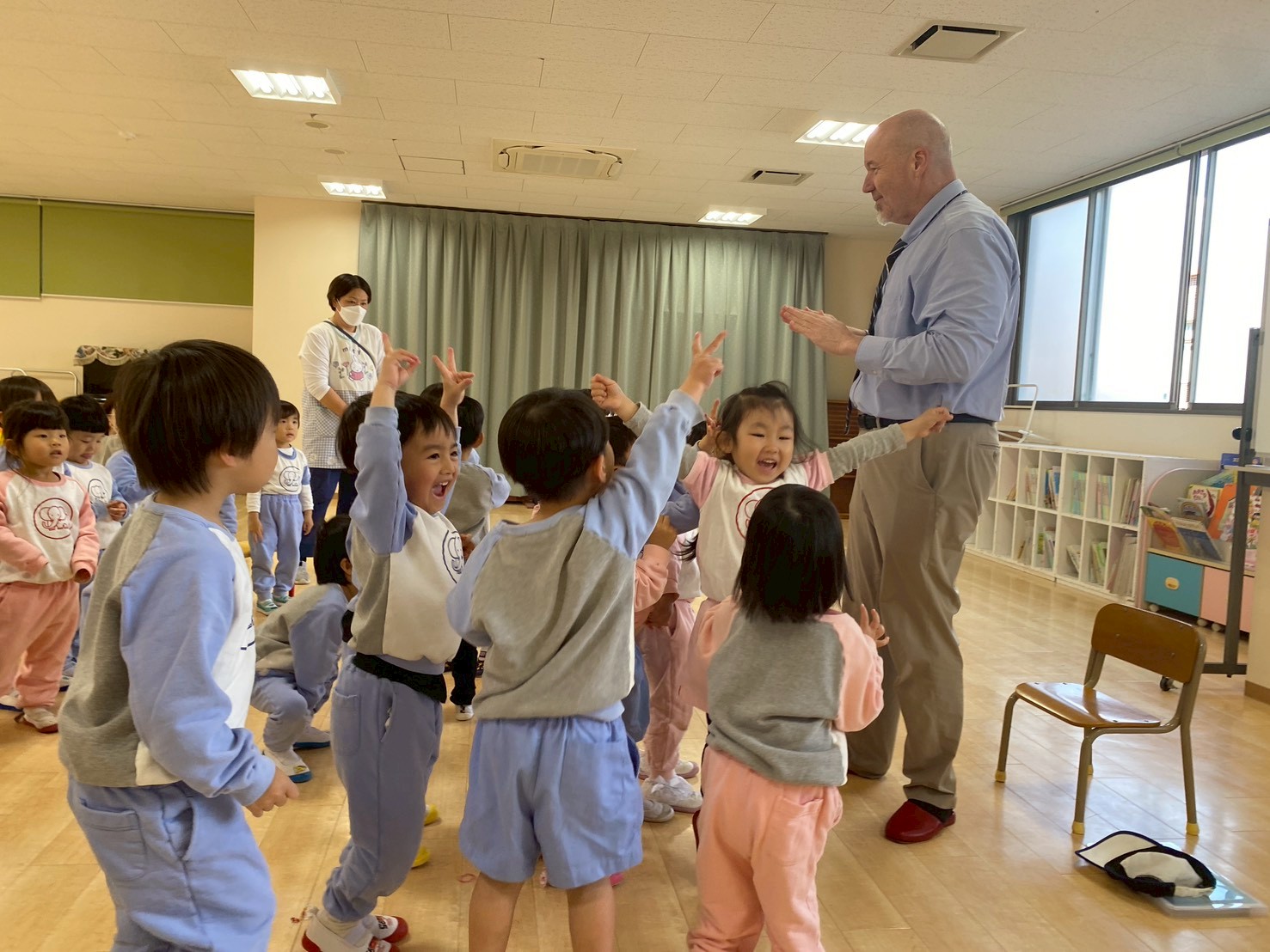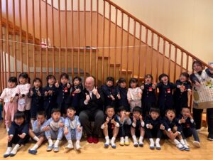 ミドルトン先生を見かけると「ハロー!」「ハロー!」と声をかける子どもたちの姿は、とても微笑ましいです。これからもみんなで楽しく英語に触れていきたいです。