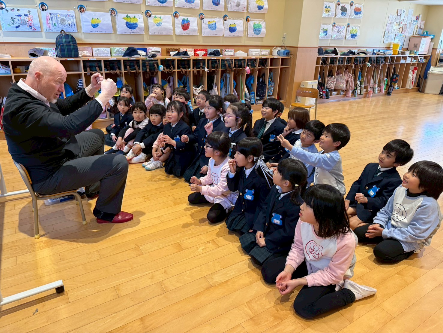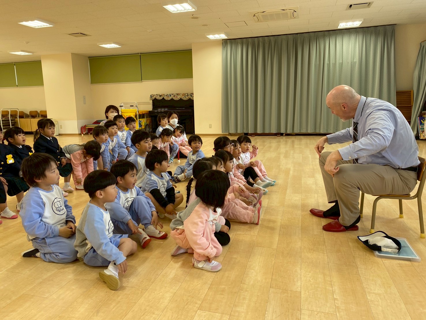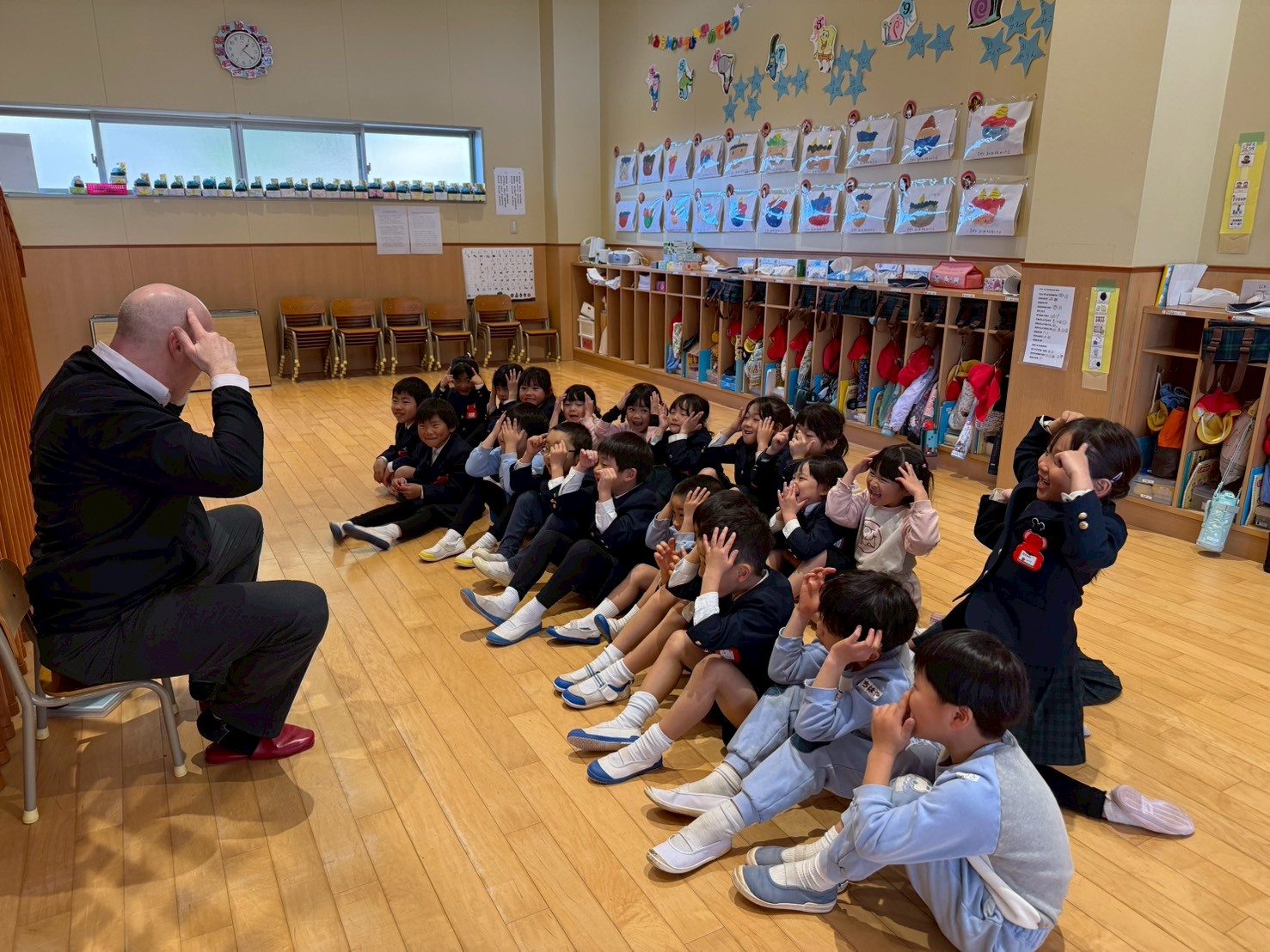 ミドルトン先生を見かけると「ハロー!」「ハロー!」と声をかける子どもたちの姿は、とても微笑ましいです。これからもみんなで楽しく英語に触れていきたいです。