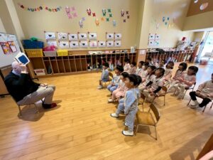 第一幼稚園では第一中学校より英語の先生にお越しいただき、英語に触れる時間を設けています。