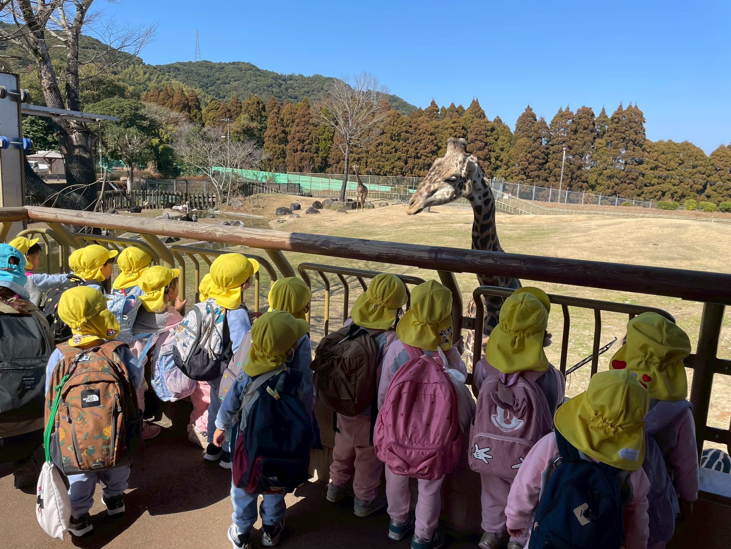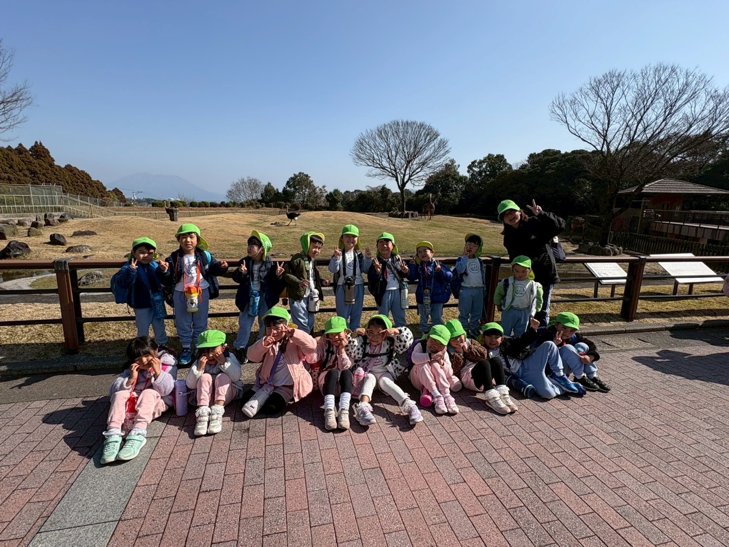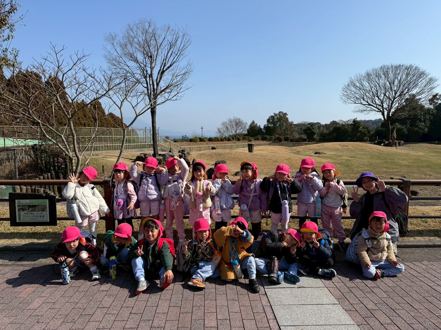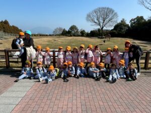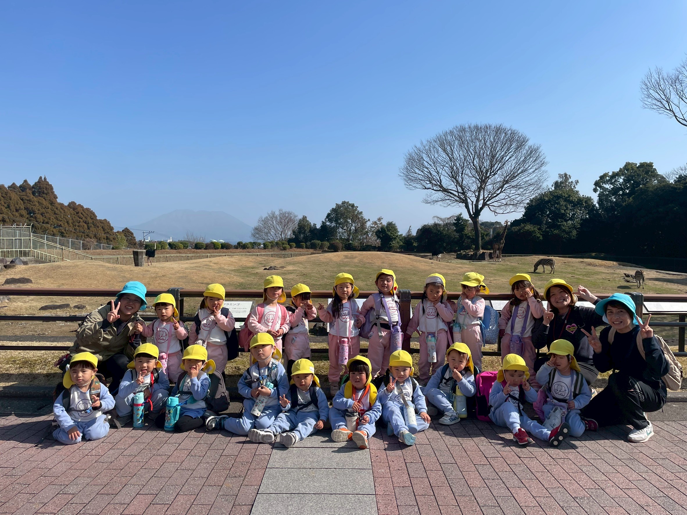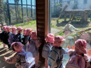 動物園で集合写真を撮影し、おいしいお弁当とおやつを食べて動物さんの見学に張り切って出発しました!