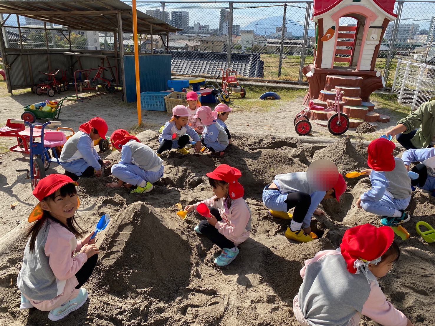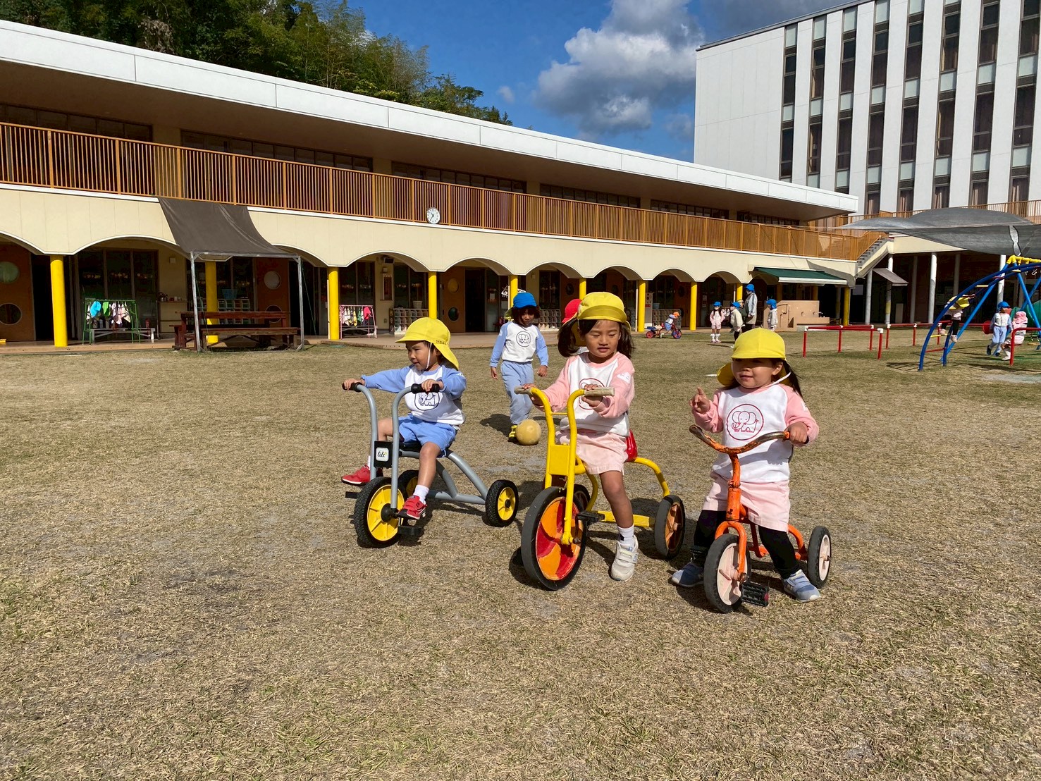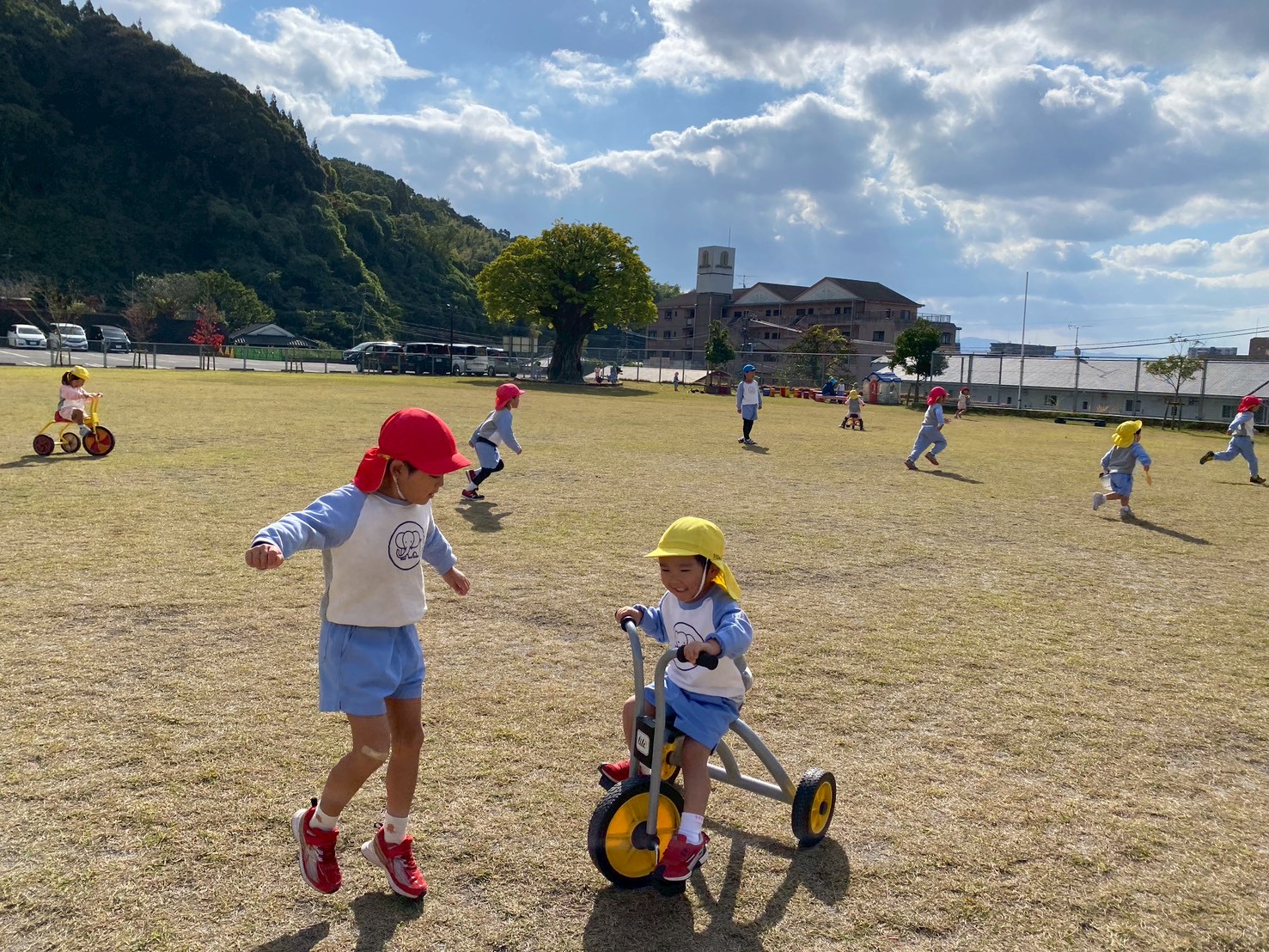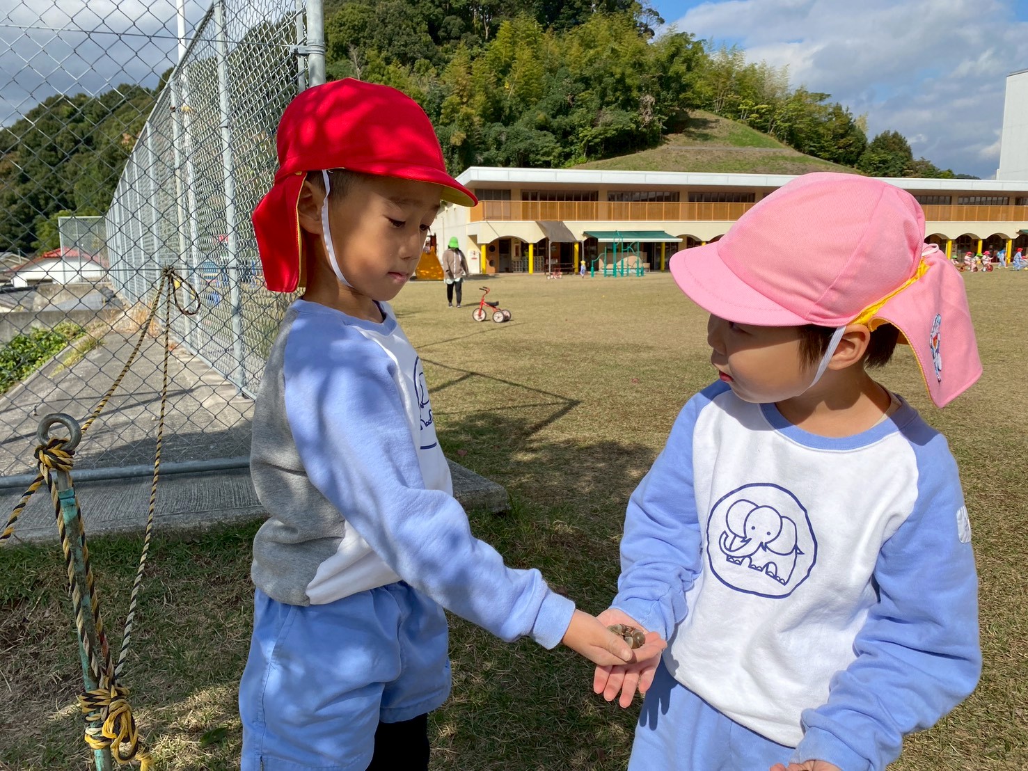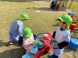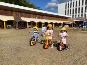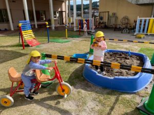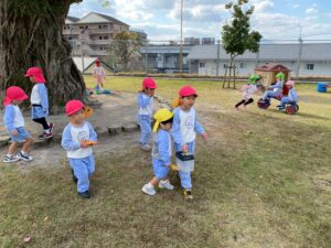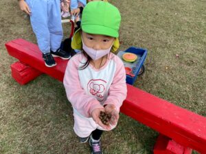 子どもたちは、園庭で毎日どんぐり探しや砂場遊び、三輪車やブランコで思いっきり体を動かして楽しく遊んでいます♪また、「一緒に遊ぼう‼」と、お友達を誘って仲良く遊ぶ姿もたくさん見られます♡