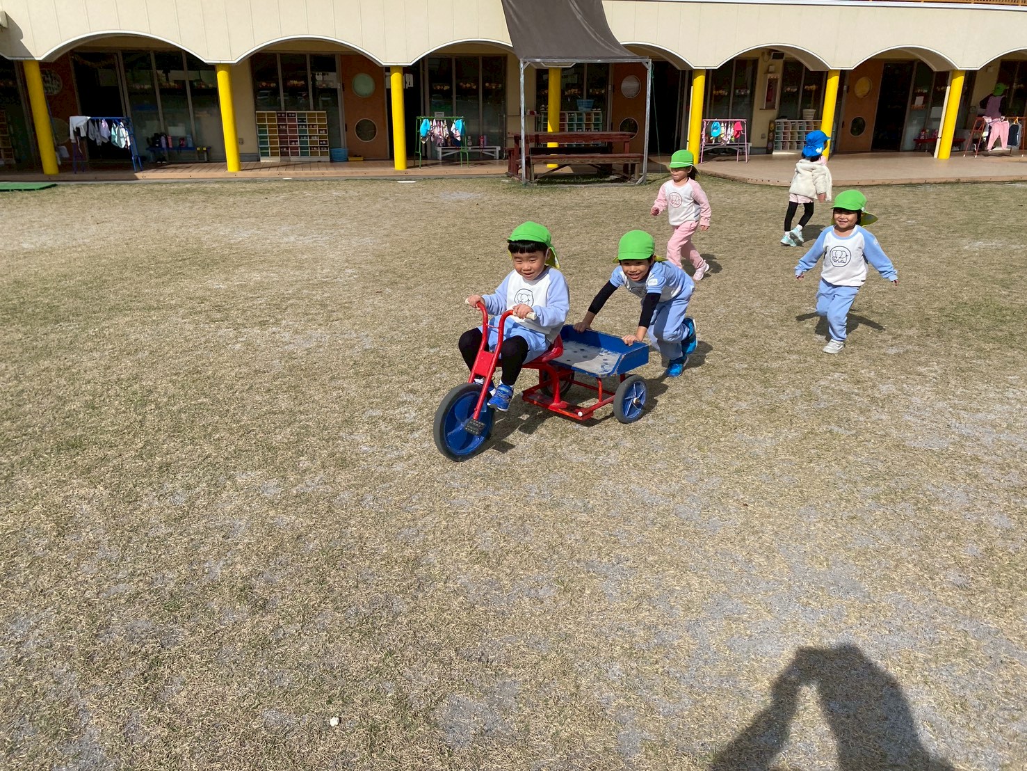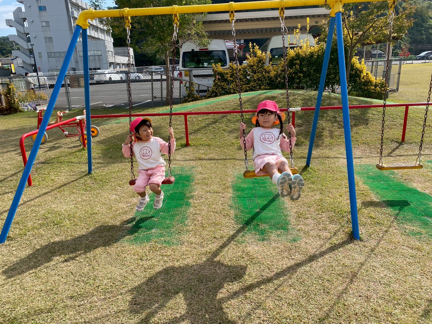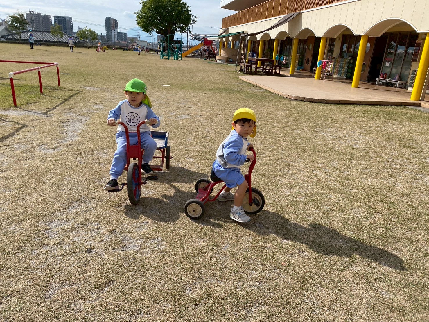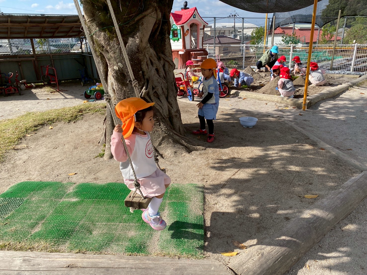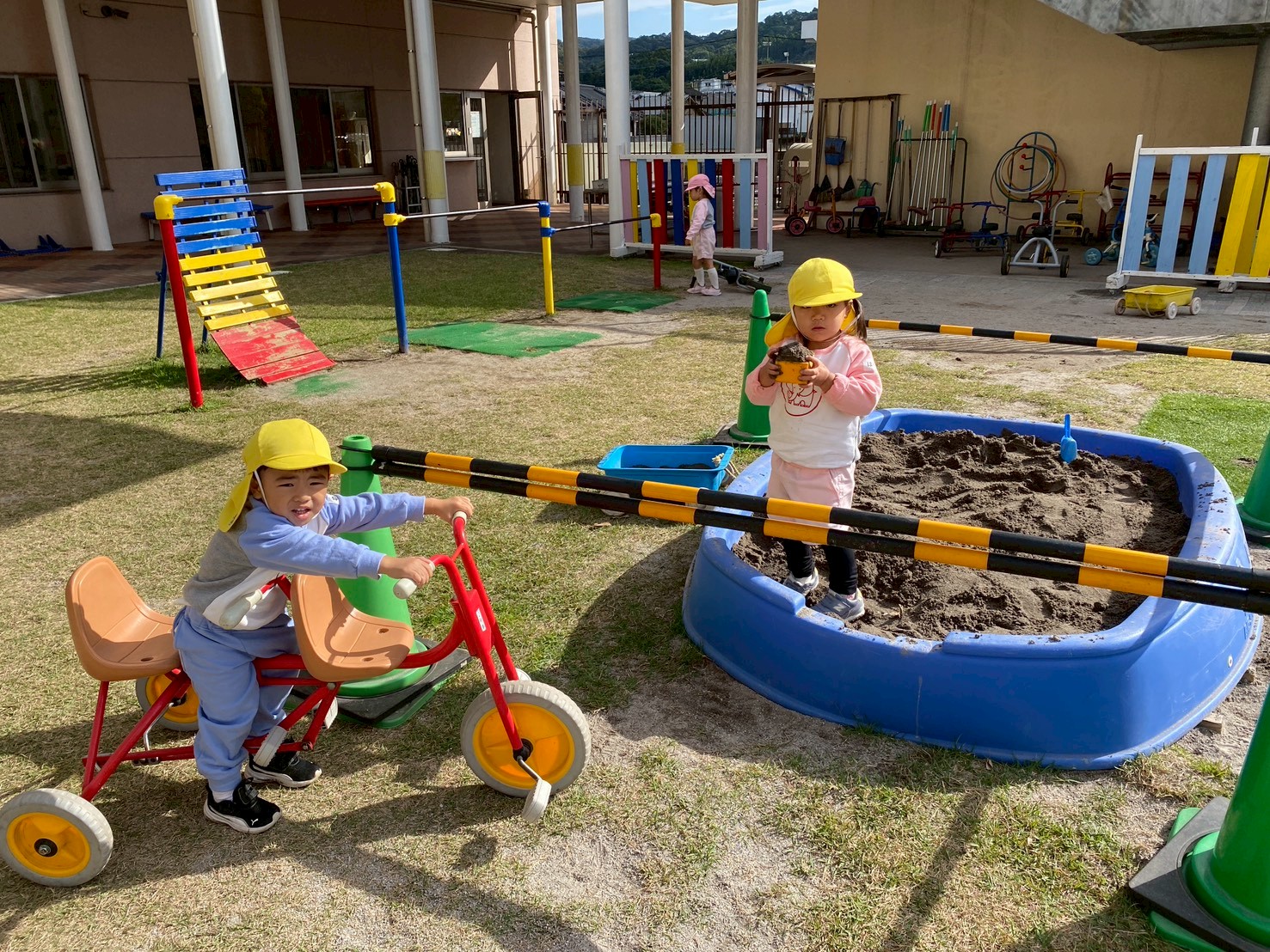 子どもたちは、園庭で毎日どんぐり探しや砂場遊び、三輪車やブランコで思いっきり体を動かして楽しく遊んでいます♪また、「一緒に遊ぼう‼」と、お友達を誘って仲良く遊ぶ姿もたくさん見られます♡