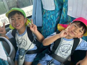 年長・年中・年少さんは第一工科大学の大型バス、年少少組さんは幼稚園の園バスで公園に向かいました。