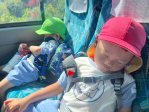 幼稚園へ帰るバスの中は、遊び疲れて熟睡する姿も…。