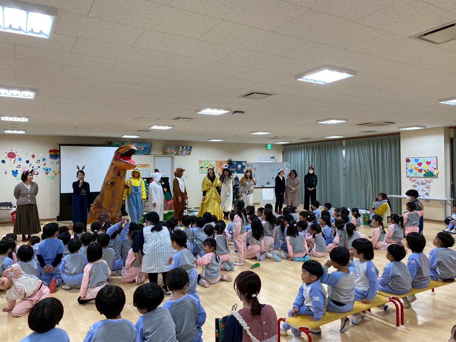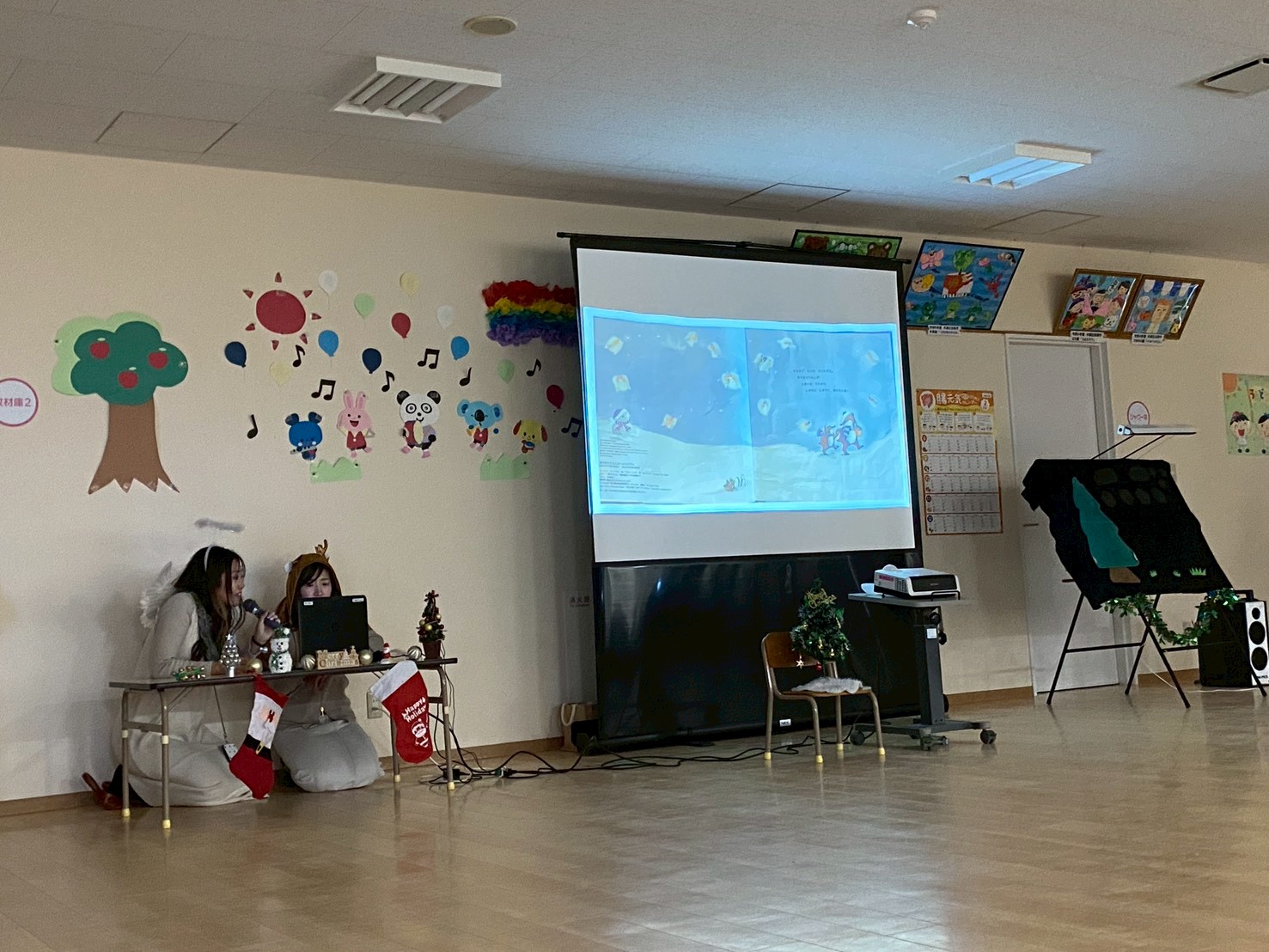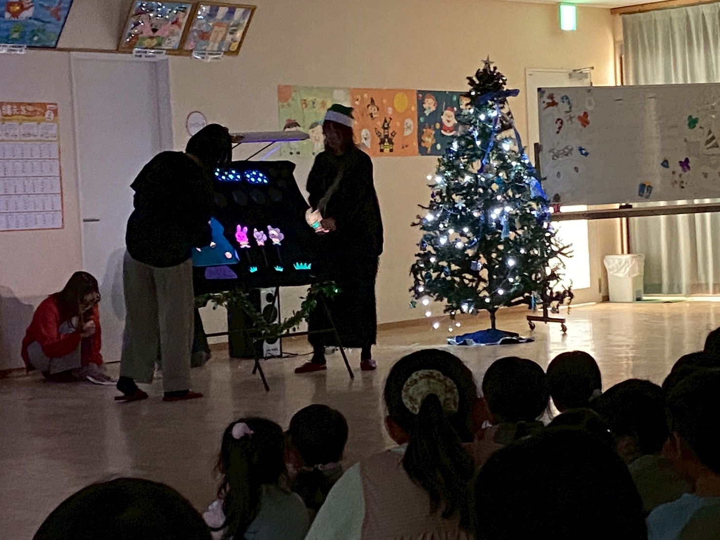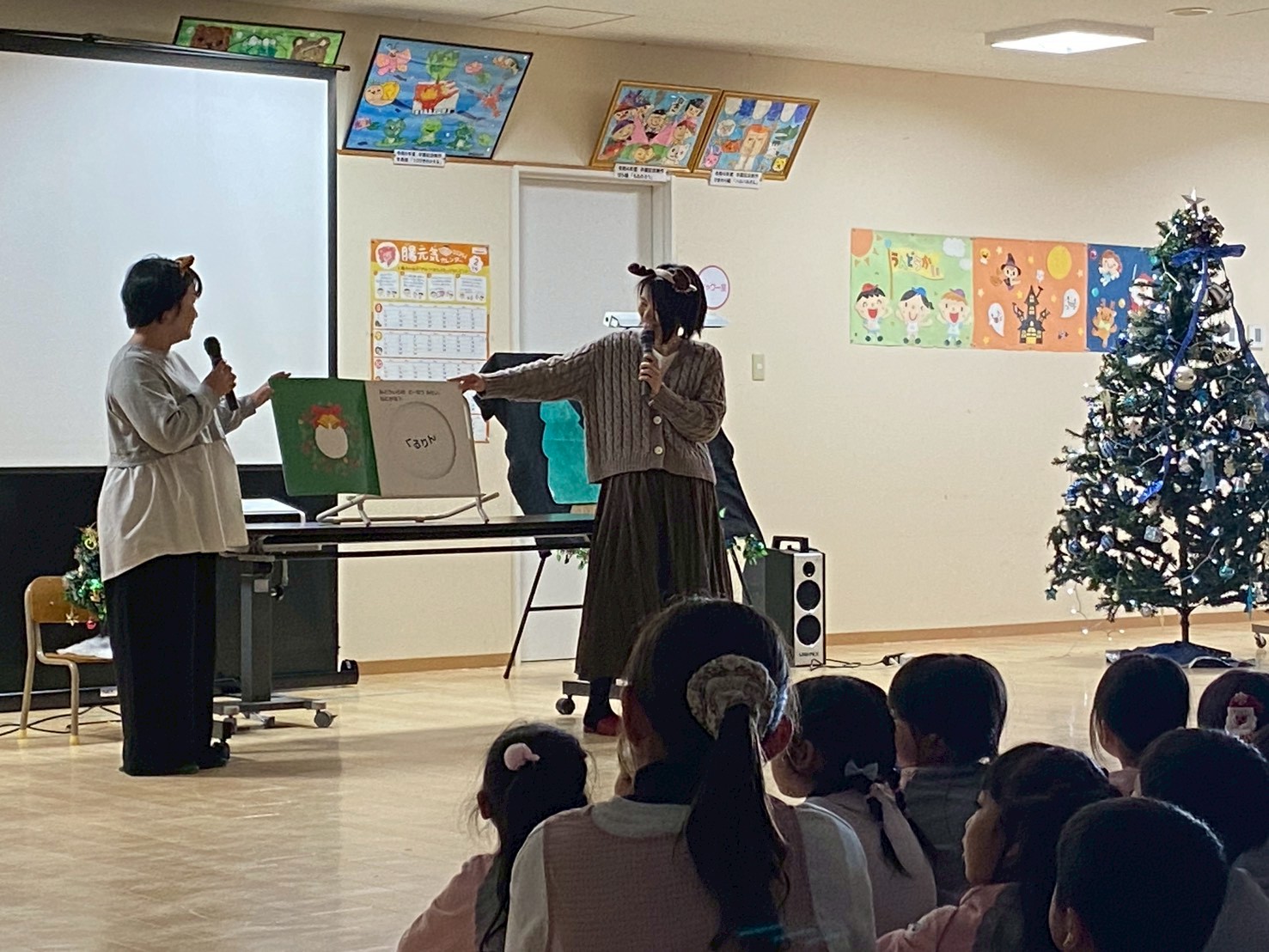 先日、くすくすクリスマス読書会が行われ、子どもたちはたくさんのお話に触れることができ大喜びでした。合奏「ジングルベル」、大型絵本「クリスマスのかくれんぼ」、スクリーン絵本「きらきらてんしのクリスマス」、ハンドルベル演奏「きよしこの夜」、ブラックシアター「ほしのクリスマス」、大きなかぶで、いろいろなキャラクターそして、最後にクリスマスプレゼントが入った大きな大きな箱出て、大盛り上がりでした☆彡