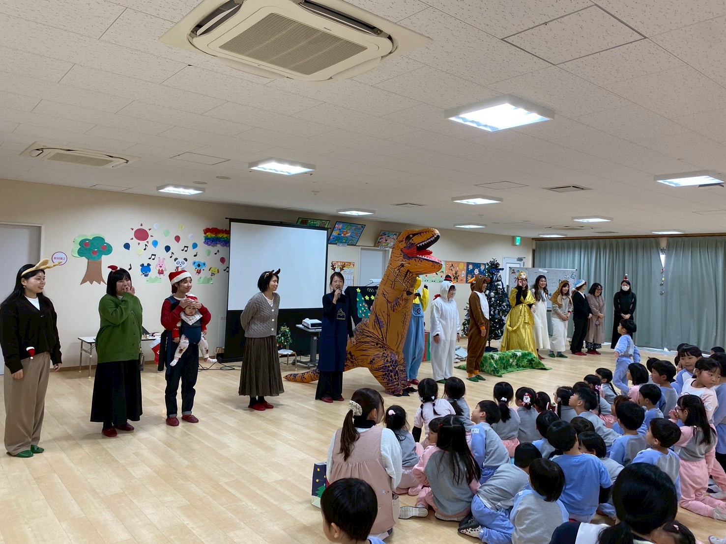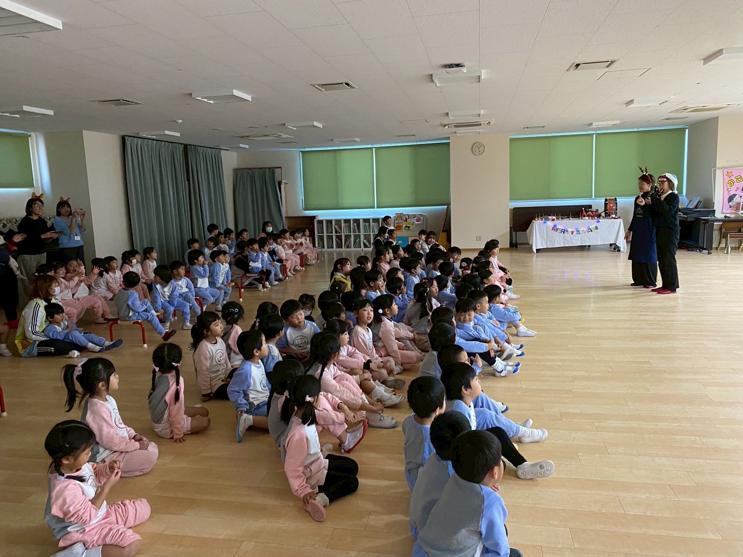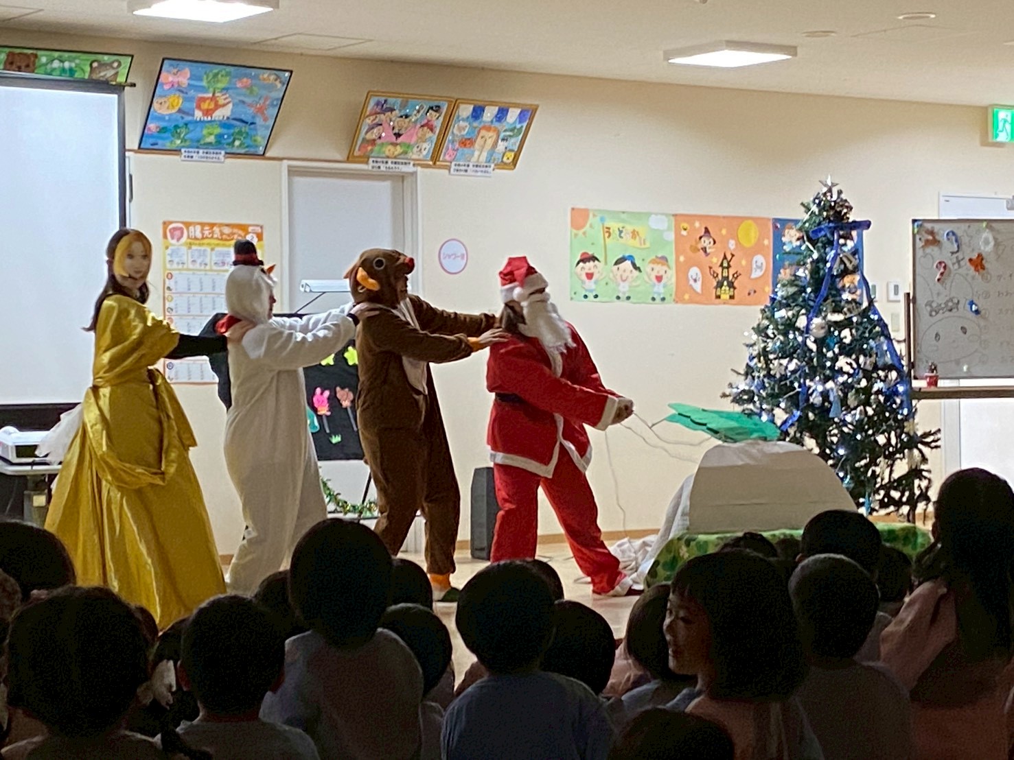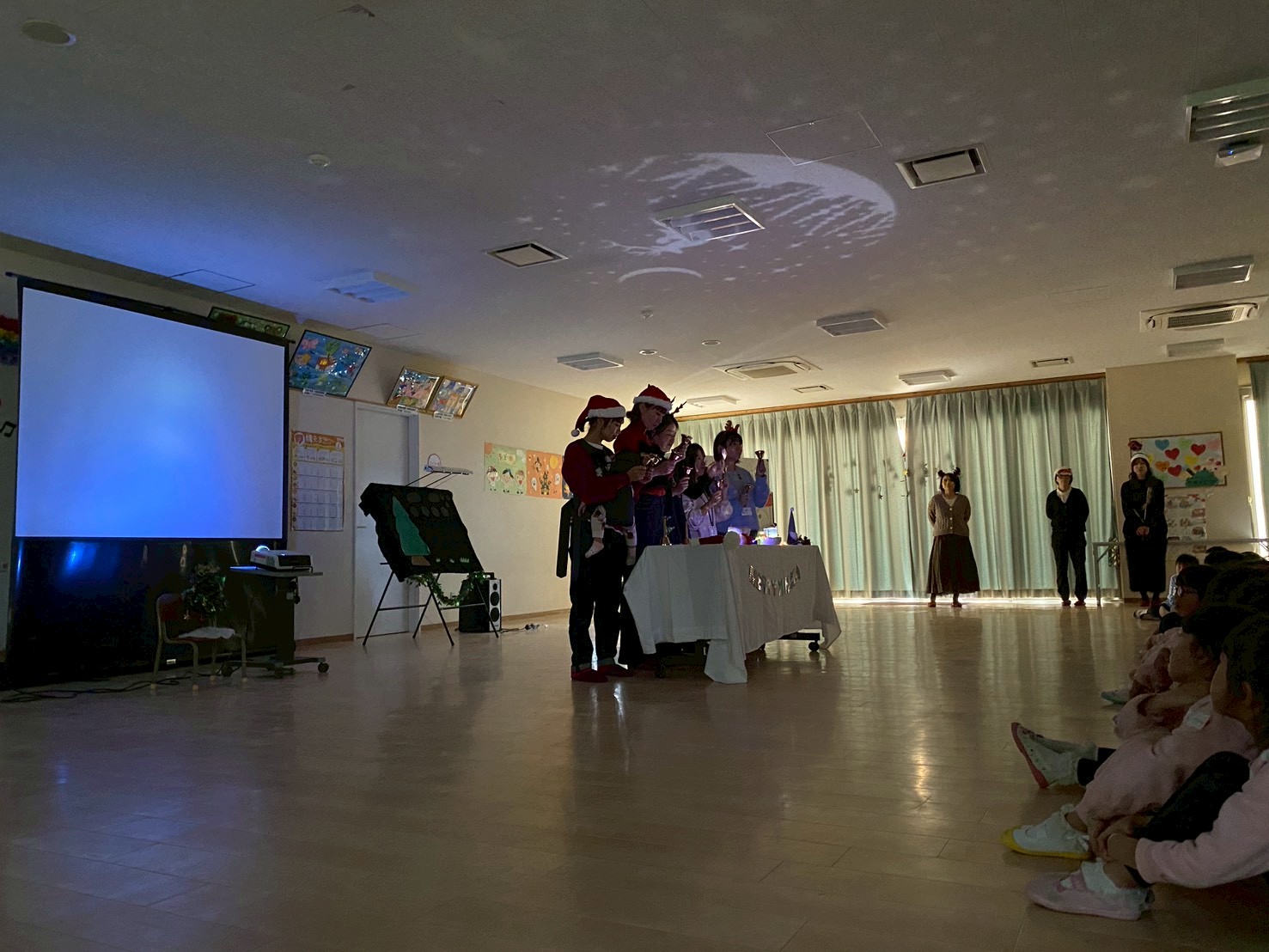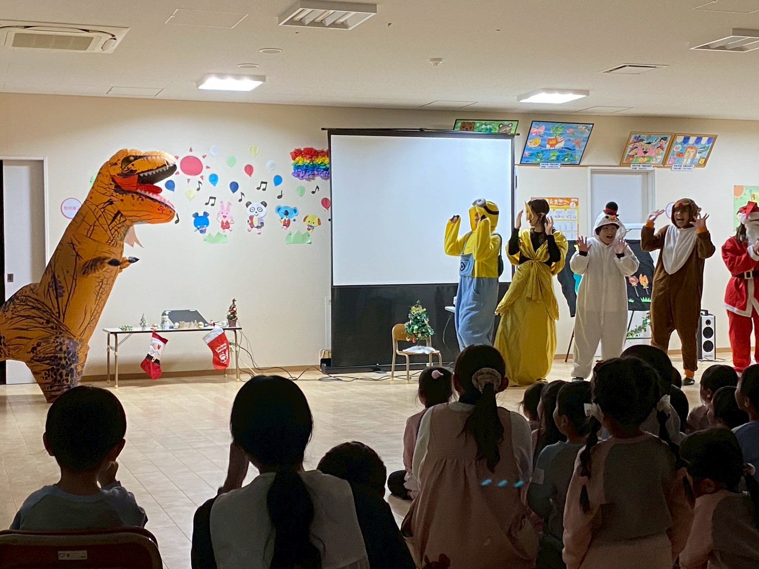 先日、くすくすクリスマス読書会が行われ、子どもたちはたくさんのお話に触れることができ大喜びでした。合奏「ジングルベル」、大型絵本「クリスマスのかくれんぼ」、スクリーン絵本「きらきらてんしのクリスマス」、ハンドルベル演奏「きよしこの夜」、ブラックシアター「ほしのクリスマス」、大きなかぶで、いろいろなキャラクターそして、最後にクリスマスプレゼントが入った大きな大きな箱出て、大盛り上がりでした☆彡